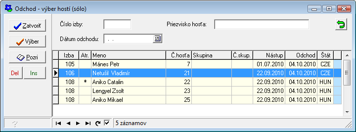 - Pre vykonanie odchodu viacerých hostí je potrebné označiť jednotlivých hostí. Na označenie je možné využiť tlačidlo Ins. Zvolený hosť má v poslednom stĺpci príznak fajky. Na zrušenie označenia slúži tlačidlo Del. Po označení všetkých hostí, u ktorých sa bude realizovať odchod je potrebné stlačiť tlačidlo Výber.