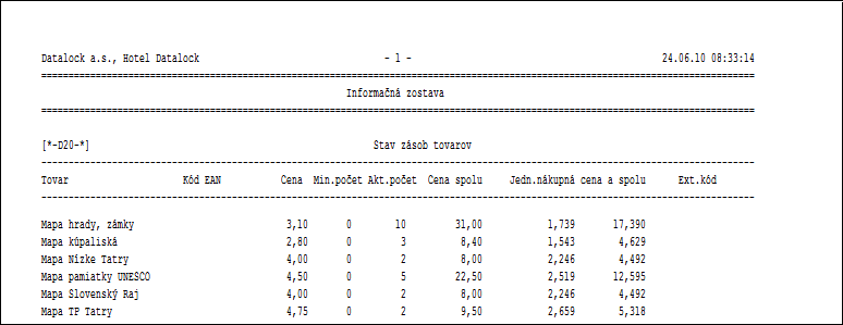 Zostava D20-Stav skladových zásob prehľadne zobrazuje zásoby na sklade v okamihu vygenerovania zostavy. Stav tovarov zohľadňuje aj tovary naťažené na účty hostí.