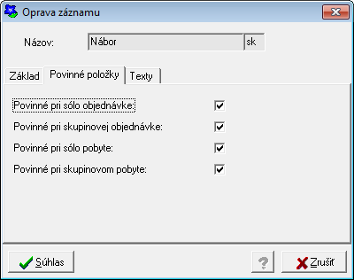 - Pobyty, objednávky - príznak parametra pobytu. Ak je checkbox začiarknutý, potom sa tento parameter zobrazuje/používa pri nahrávaní objednávok a pobytov.