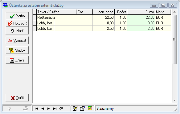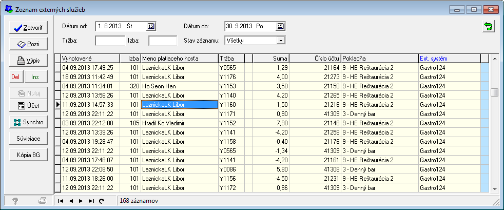 Po vyvolaní funkcie systém zobrazí formulár so zoznamom externých služieb za aktuálny pobytový deň. Zoznam je zoradený vzostupne podľa dátumu a času prijatej externej tržby. Záznamy je možné kedykoľvek zoradiť podľa iného kľúča, a to jednoduchým kliknutím na hlavičku stĺpca, podľa ktorého má byť zoradenie vykonané.