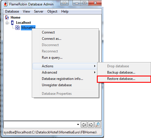 V submenu Monetka je potrebné pravým tlačidlom myši vyvolať popup menu a zvoliť Actions –> Restore database