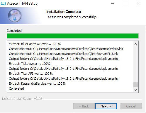 <viewsecurity consultant /> Táto verzia inštalára slúži na inštalovanie pri offline pripojení. Inštalátor nájdete na http://www.hotelovesystemy.sk/secret/. Pre online inštalovanie je možné použiť online verziu inštalátora. Inštalátor pre automatické inštalovanie aplikačného serveru Widly-fly je k stiahnutiu FTP:/produkty/hotelove_systemy/horec-w/titan/TITAN_install_widlyfly.exe. Pomocou inštalátora je možné nainštalovať všetky moduly aplikácie Titán. Widly-fly sa nainštaluje priamo do Servisov, rovnako databáza Posgre. Pri inštalácii je potrebné admin práva. Cestu pri inštalácii najlepšie zvoliť C:\datalockHotel\. Ak je pri inštalácii otvorené okno so službami, je potrebný refresh okna F5.